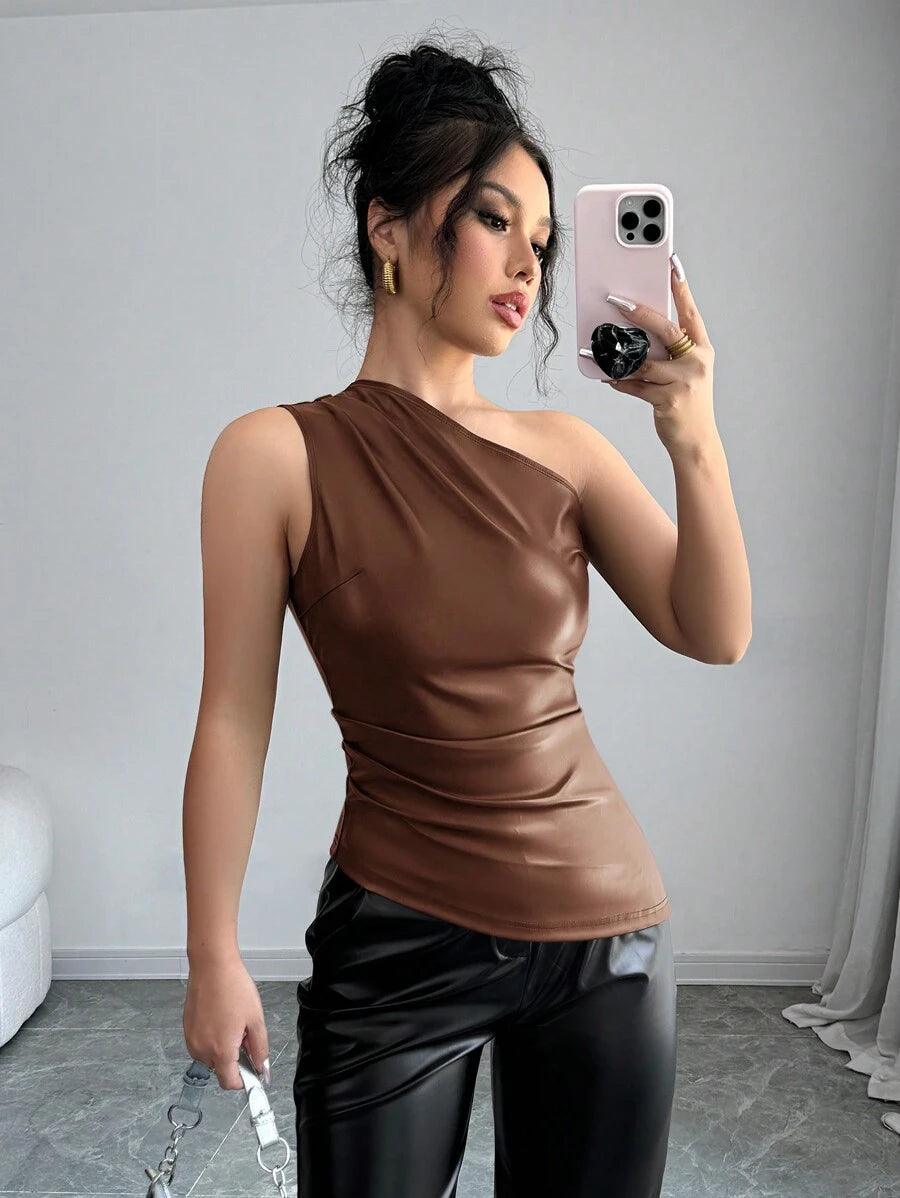 A Blusa Um Ombro Só em Couro é a escolha certa para quem busca um look marcante, sensual e com personalidade.