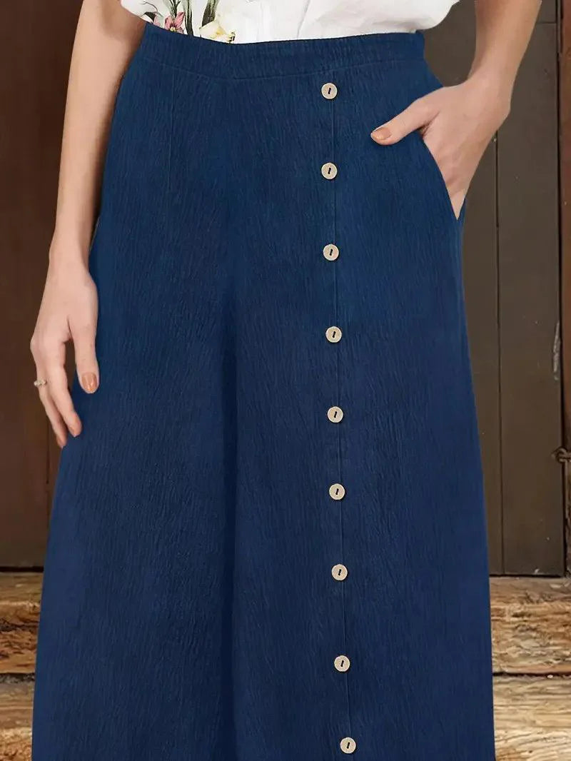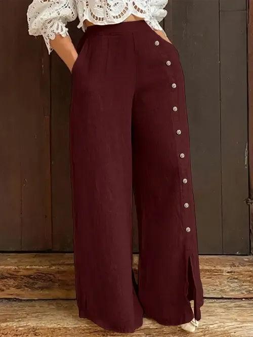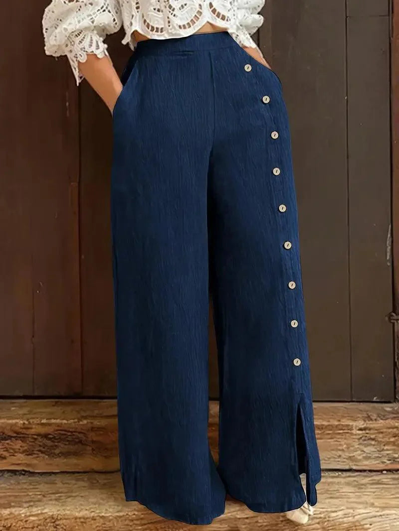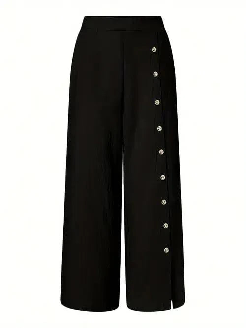 Design Moderno: A modelagem pantalona com fenda e os detalhes em botões adicionam um toque de sofisticação ao seu look casual, perfeito para um visual chic e descomplicado.