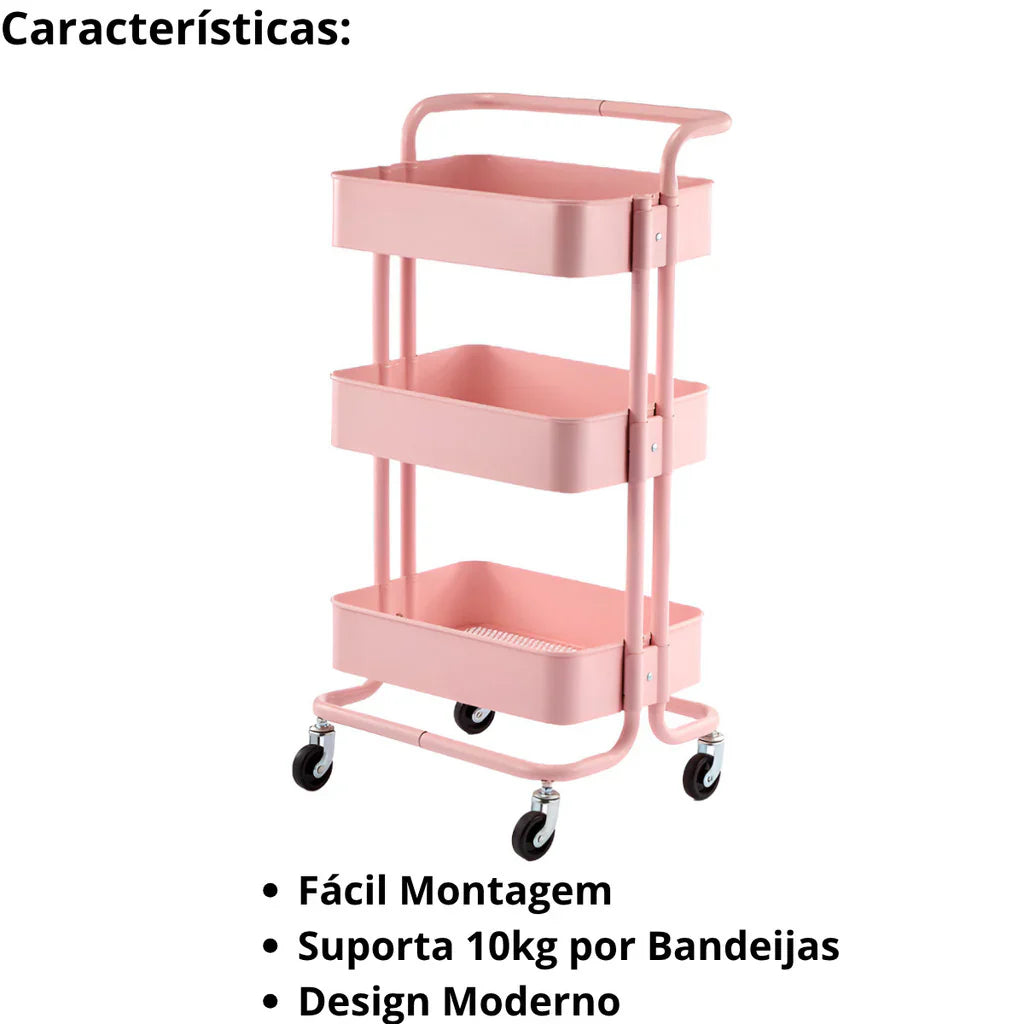 Compre Carrinho Organizador Multiuso com 03 Prateleiras Rosa Casa Cozinha Escritório Prático Funcional na Shopee Brasil! Mantenha tudo ao seu alcance com o Carrinho Organizador Multiuso! Com 3 prateleiras espaçosas, ele é perfeito para organizar itens na cozinha, banheiro, escritório, lavanderia ou qualquer outro ambiente da casa. Características: - Design moderno e compacto; - 4 (quatro) rodízios de rodinhas 360º para fácil movimentação; - Estrutura resistente e durável (Ideal para armazenar alimentos, produtos de limpeza, cosméticos e muito mais); - Cor: Rosa; - Material: Aço Carbono e ABS (plástico rígido); - Bandejas em plástico rígido com fundo vazado; - Capacidade: 10kg por prateleira; - Alças ergonômicas para movimentação. Medidas Aproximadas: - Altura total: 86 cm; - Largura total: 36 cm; - Comprimento total: 41 cm; - Altura do cesto: 5 cm; - Largura do cesto: 27 cm; - Comprimento do cesto: 37 cm. Deixe seu espaço mais organizado, prático e funcional com este carrinho versátil! Acompanha manual de montagem. Garantia: 03 meses.