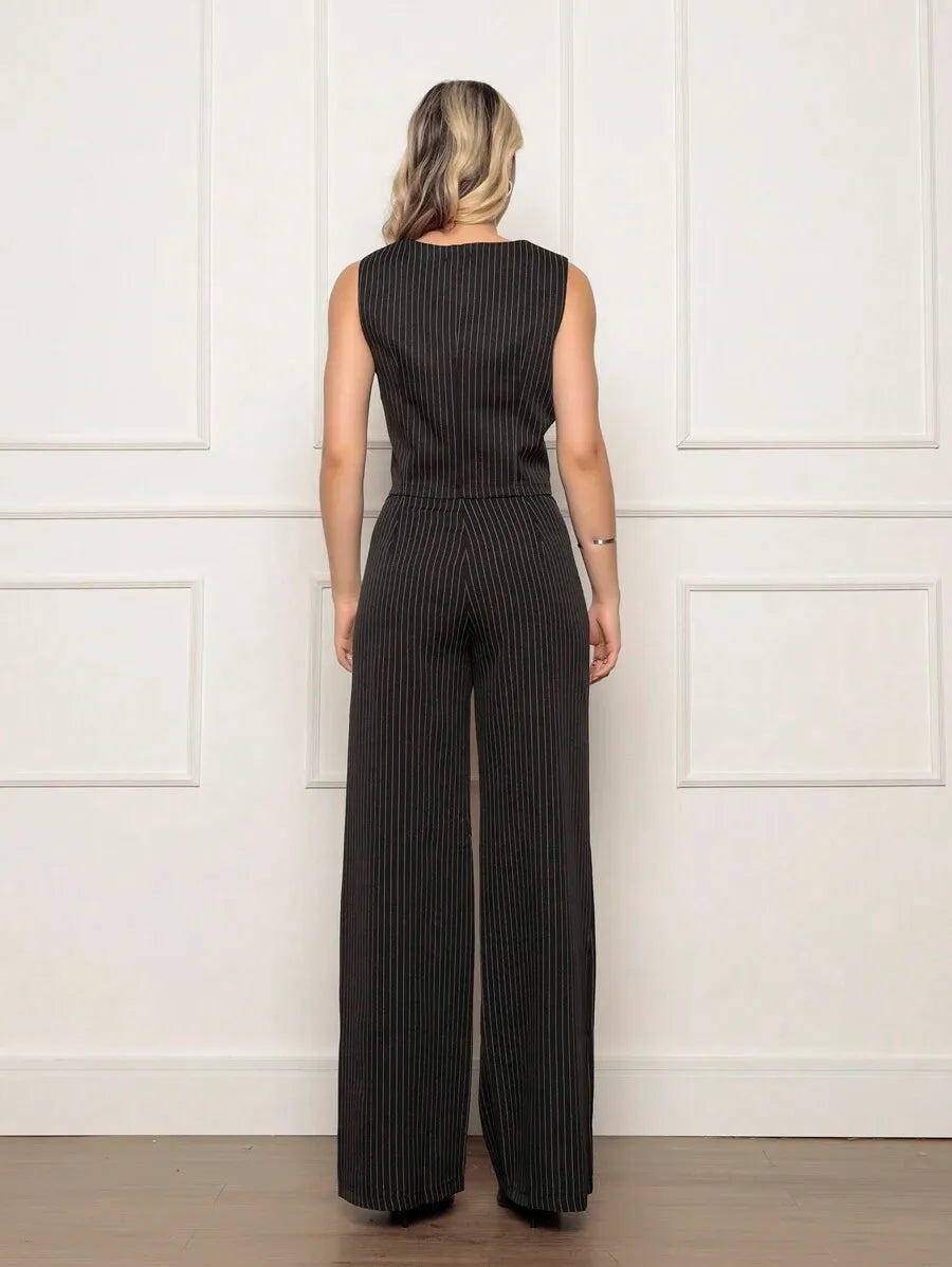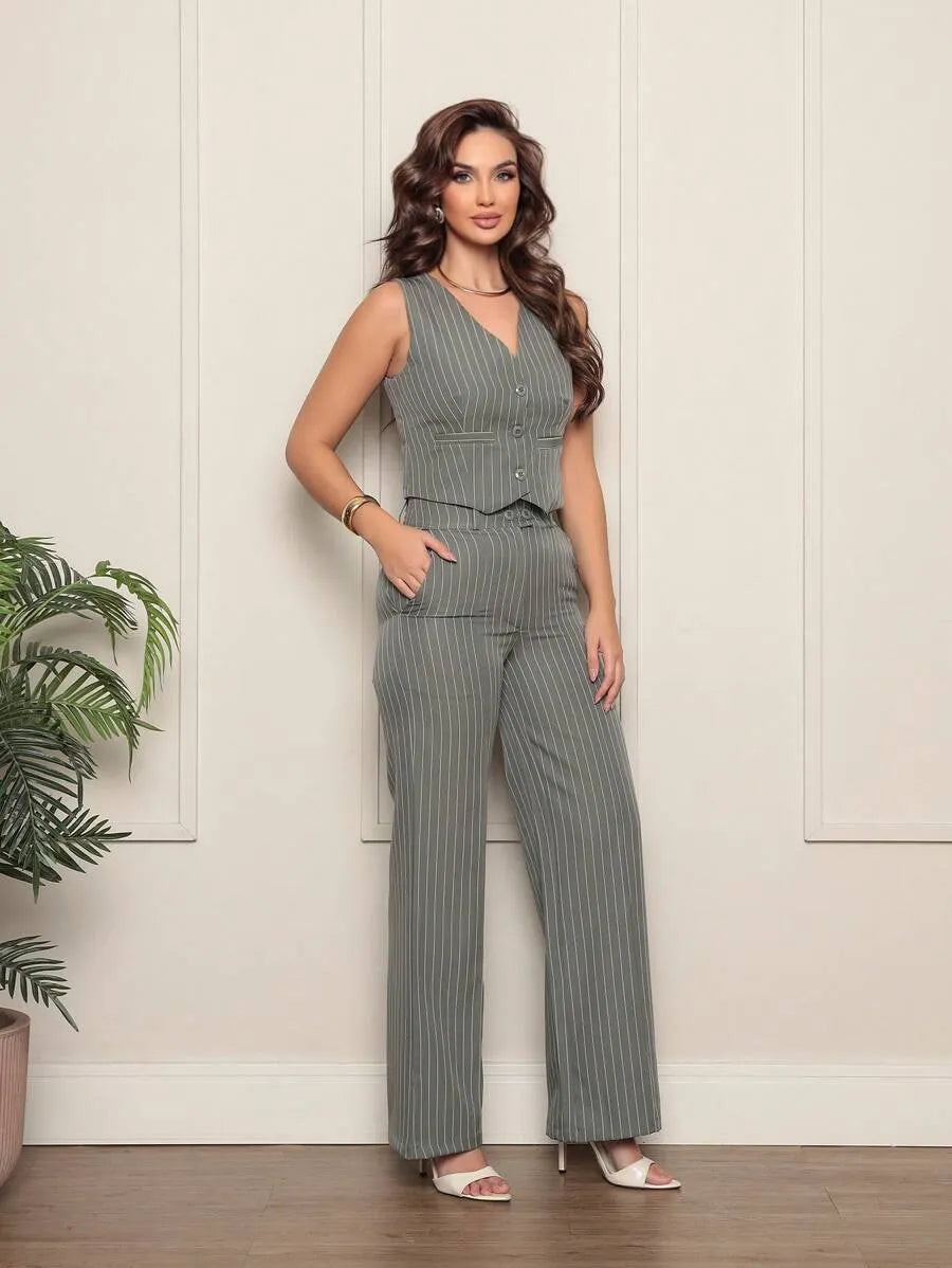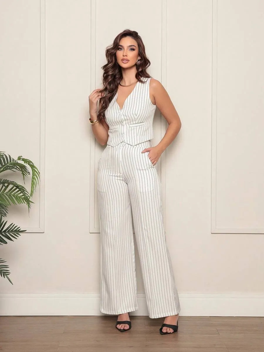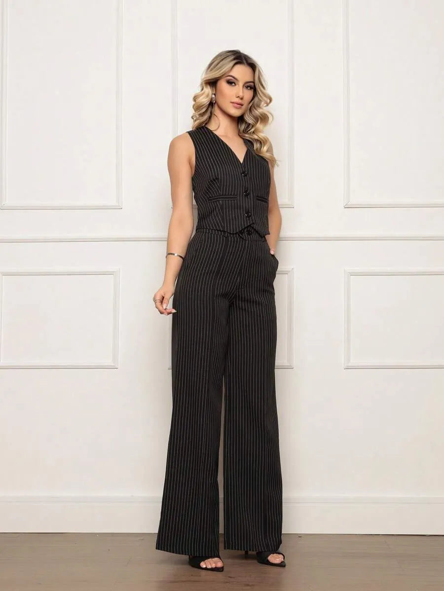 Composto por colete alongado e calça de alfaiataria listrada, o Conjunto Eloisa é sinônimo de sofisticação e conforto, ideal para ocasiões especiais ou para elevar seu dia a dia com um toque fashion.