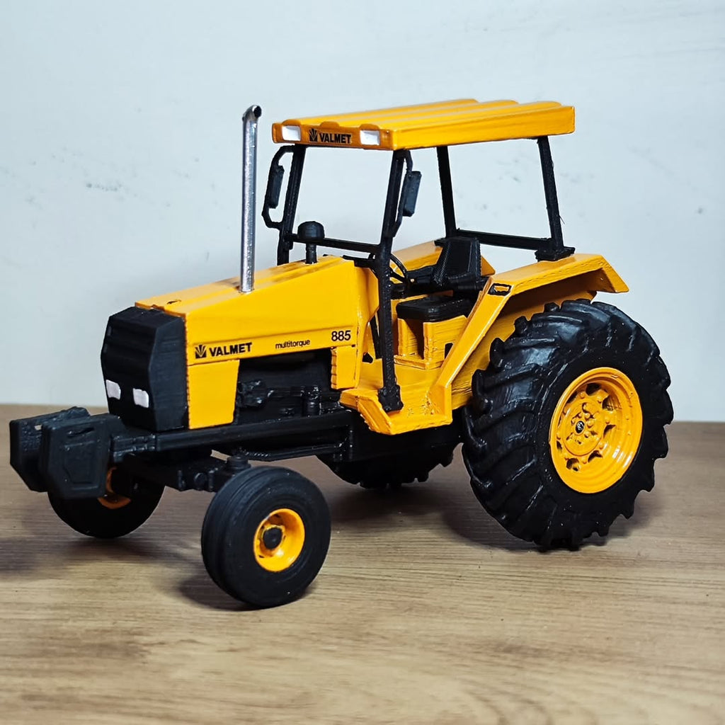 Rodas com pneus de borracha, com rodas duplas na frente e simples atrás, além de eixo traseiro oscilante que adiciona realismo